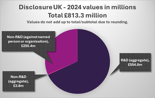 - Total disclosed value, including R&D and non-R&D, increased by 17% to £813.3 million in 2024, from £692.5 million in 2023, and £642.1 million in 2022.